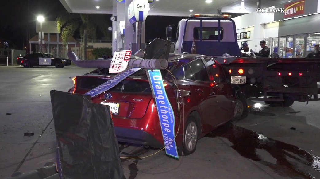 The suspect ultimately crashed into a light pole in the area of Brookhurst Road and Orangethorpe Avenue and then a parked tow truck at a Chevron station across the street from a McDonald’s.