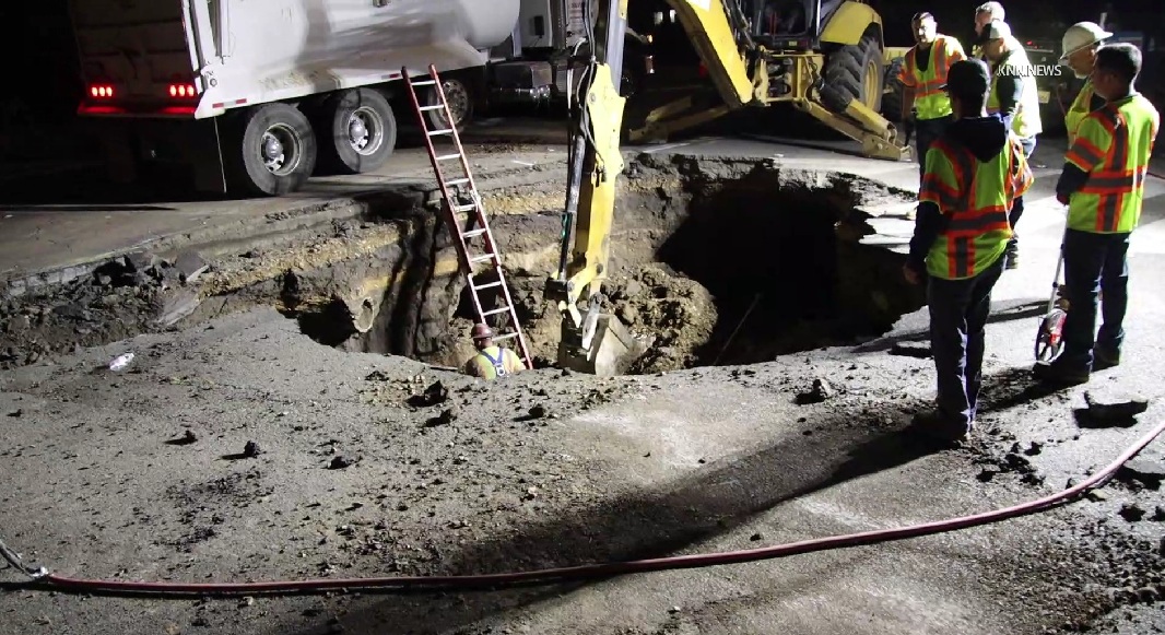 Crews worked overnight to repair a large sinkhole that opened up in the middle of a major street on Saturday, Oct. 4.