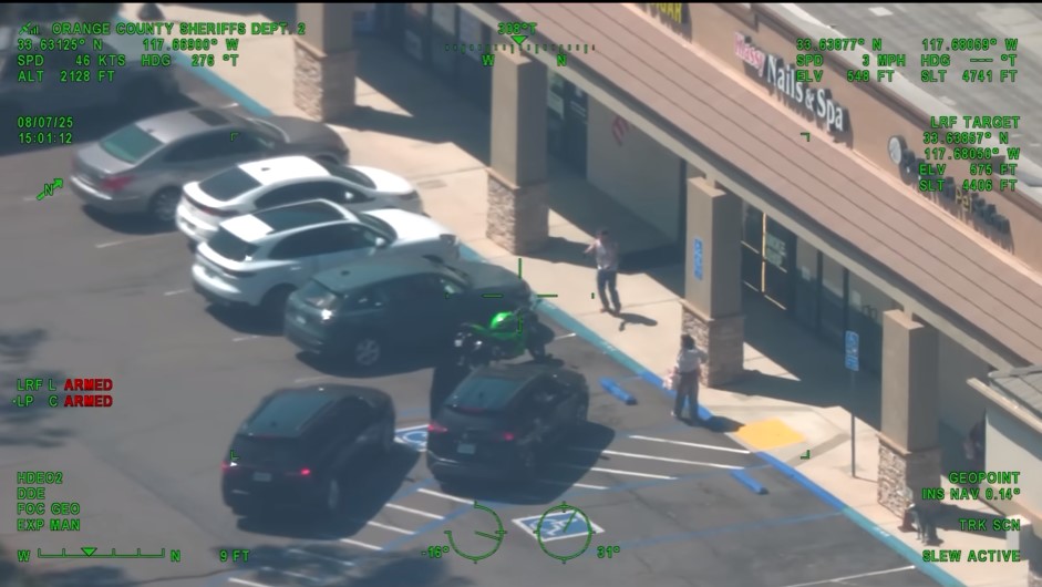 A 34-year-old Lake Forest man wanted on suspicion of domestic violence briefly pointed a handgun at undercover Orange County sheriff’s deputies in August before one deputy opened fire as the man ran away with the weapon still in his hand, video captured by a sheriff’s helicopter shows.