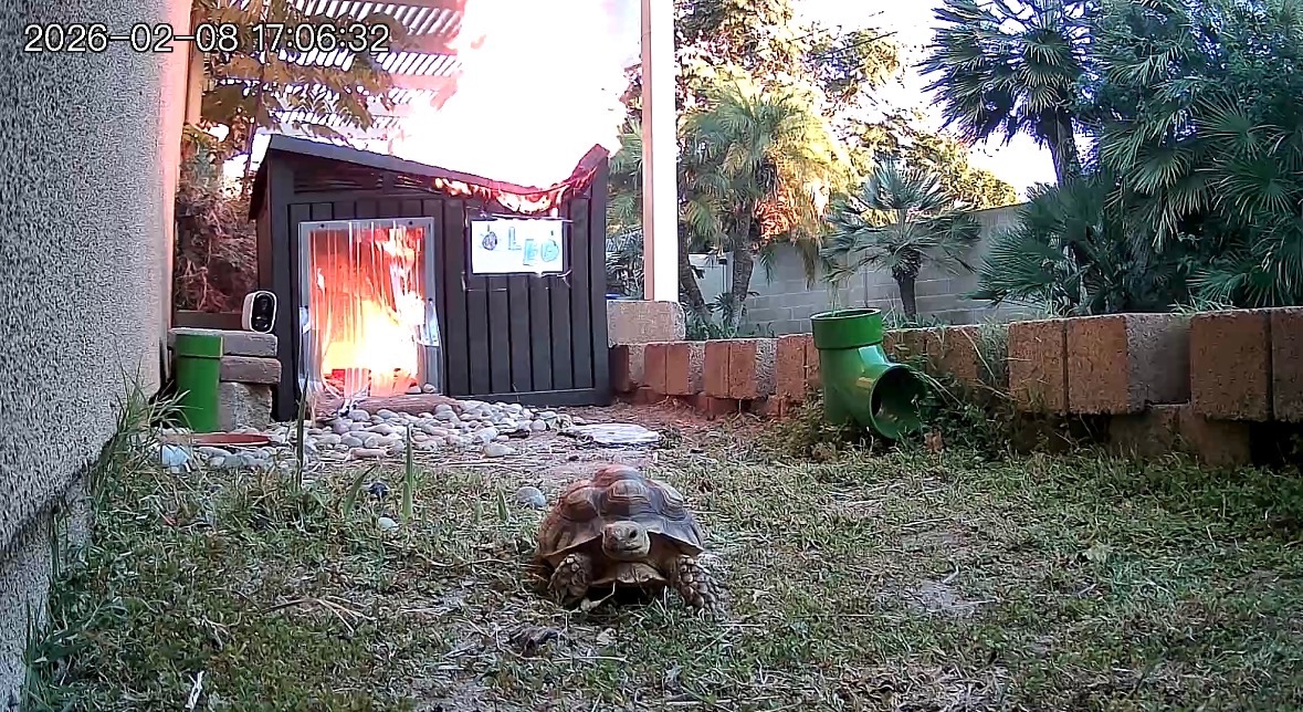 Later, Tom logged on to look at her security footage and realized Leo’s escape had been caught on camera. Footage shows the tortoise scurrying away from the burning brown shed, which had a sign with her name on the outside. Tom shared the video on social media to show Leo’s speedy escape, but also to bring awareness to the risks of heat lamps.