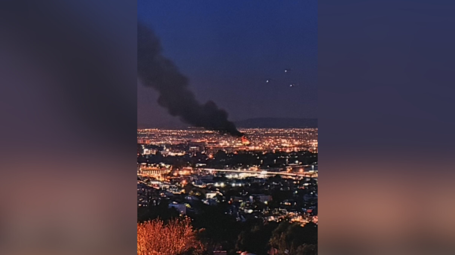 While the photo, located in the LAX Midfield Satellite Concourse, is pretty beautiful – it depicts a twilight view of most of the city, including most of L.A., parts of the hills above the urban sprawl and even some birds – it doesn’t take long for people viewing it to notice a large plume of black smoke rising into the sky, right in the middle of the shot.