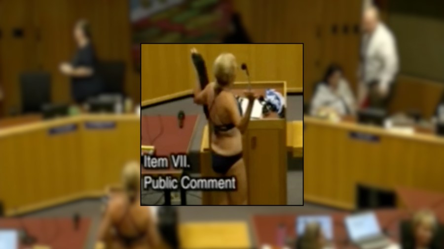 As one of the board trustees attempted to intervene, Bourne, now in a bikini bottom, objected, saying her demonstration was allowed. She tried to put on a PE uniform when the board’s vice president quickly called the meeting to recess.