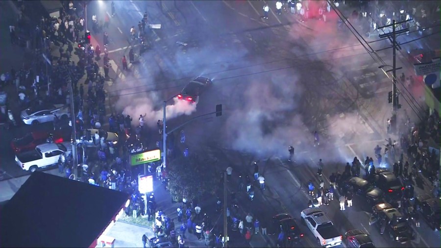 Fans across Los Angeles took to the streets to celebrate after the Dodgers beat the Toronto Blue Jays 5-4 to win their second straight World Series title on Nov. 1, 2025. (KTLA)