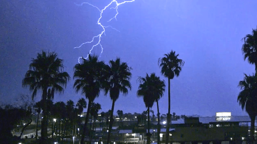 A pop-up thunderstorm brought heavy showers and lightning to the Southern California coast overnight.