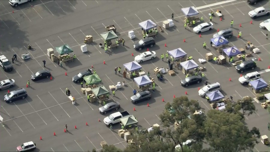 Video from Sky5 showed several tents set up with volunteers handing out fresh and non-perishable foods to those who braved the long lines, which extended several blocks along Temple Boulevard in the City of Industry.