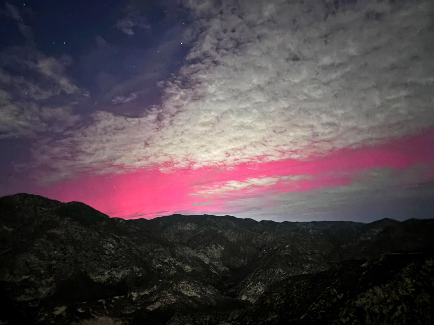 Triggered by an intense geomagnetic storm, the northern nights made a rare visit to the Southland on Tuesday night, painting the skies above the Angeles National Forest in dazzling pink and purple hues.
