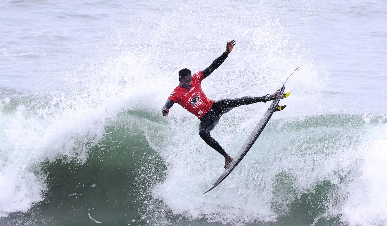 Surfers participate in the fourth annual ‘A Great Day in the Stoke,’ a celebration of Black surf culture in Huntington Beach.