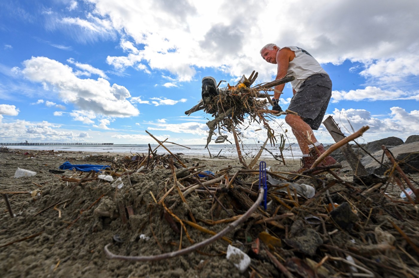 Equipped with his own rake and tarp, he scooped up sneakers, candy wrappers and Starbucks cups, among countless branches and other waste that littered the beach after some of the first heavy rain following the dry summer months.