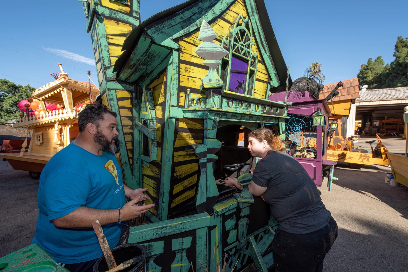 Volunteers Jonathan Maddron, left, of Anaheim and Lacie Barker of Santa Clarita strategize together as they work to put the finishing touches on a parade float during the final build day for the Halloween Parade floats that will be featured in the 102nd Anaheim Fall Festival, on Sunday, Oct. 19, 2025. (Photo by Jeff Antenore, Contributing Photographer)