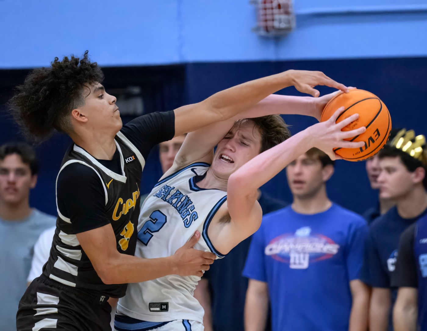Crespi guard Nickon Daei, left, is tied up by Corona del Mar forward Nolan Scott in the second round of the CIF-SS Open Division boys basketball playoffs in Corona del Mar on Friday, February 13, 2026. (Photo by Paul Rodriguez, Contributing Photographer)