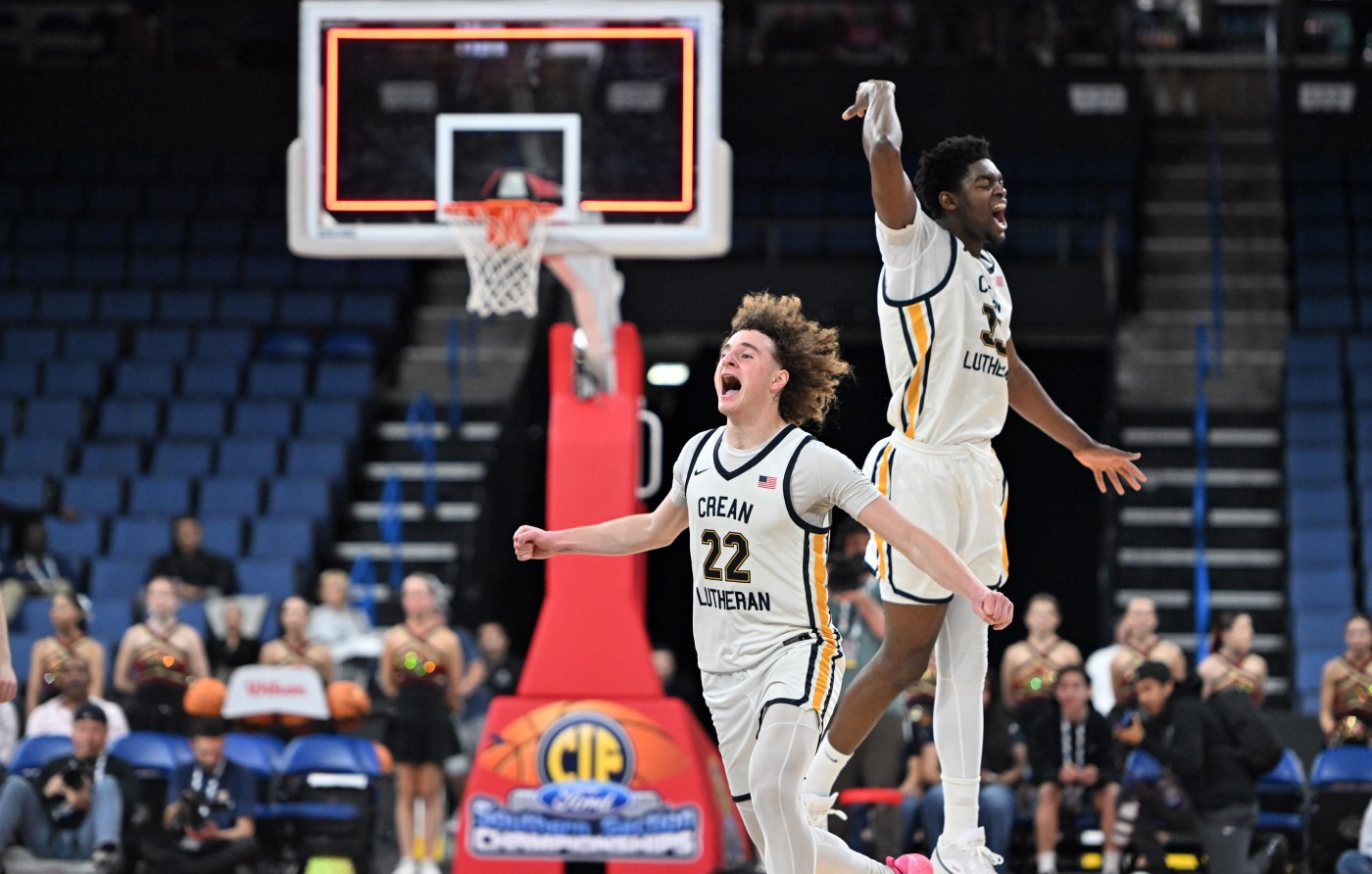 Crean Lutheran’s Nicholas Giarrusso and Chadrack Mpoyi celebrate after defeating JSerra 59-52 in the CIF-SS Division 1 championship game at Toyota Arena in Ontario on Saturday, Feb. 28, 2026. (Photo by Milka Soko, Contributing Photographer)
