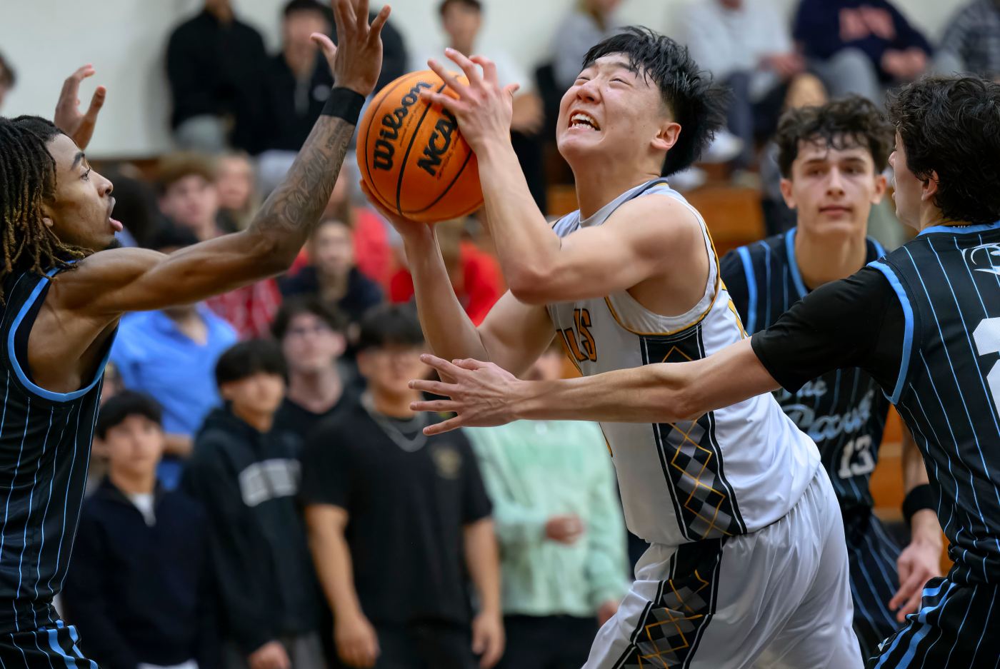 Villa Park guard Hayden Hakala, center, struggles to get a shot betwen El Dorado forward Jack Boettner, left, and center Ryan Northcott, right, in a Freeway League basketball game in Placentia on Friday, January 23, 2026. (Photo by Paul Rodriguez, Contributing Photographer)