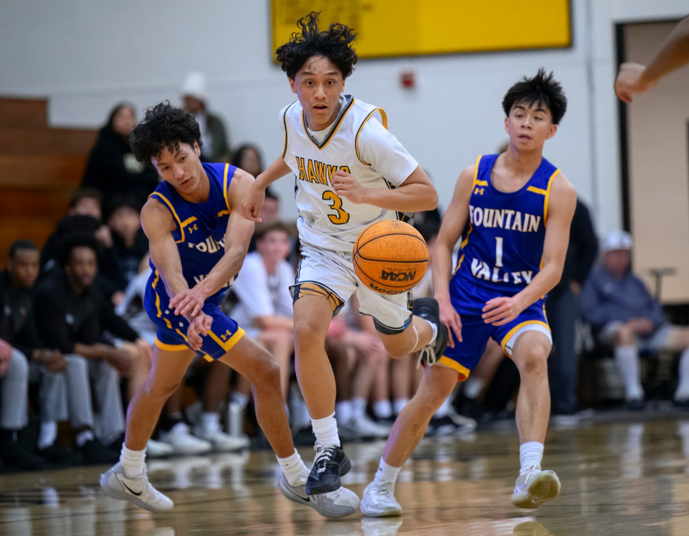 El Dorado forward Dean Armand, left, beats Fountain Valley forward Isaac Chinchilla, center, and guard Grant Wilson, right, to score a basket in the first round of the CIF-SS Division 2 boys basketball playoffs in Placentia on Wednesday, February 11, 2026. (Photo by Paul Rodriguez, Contributing Photographer)