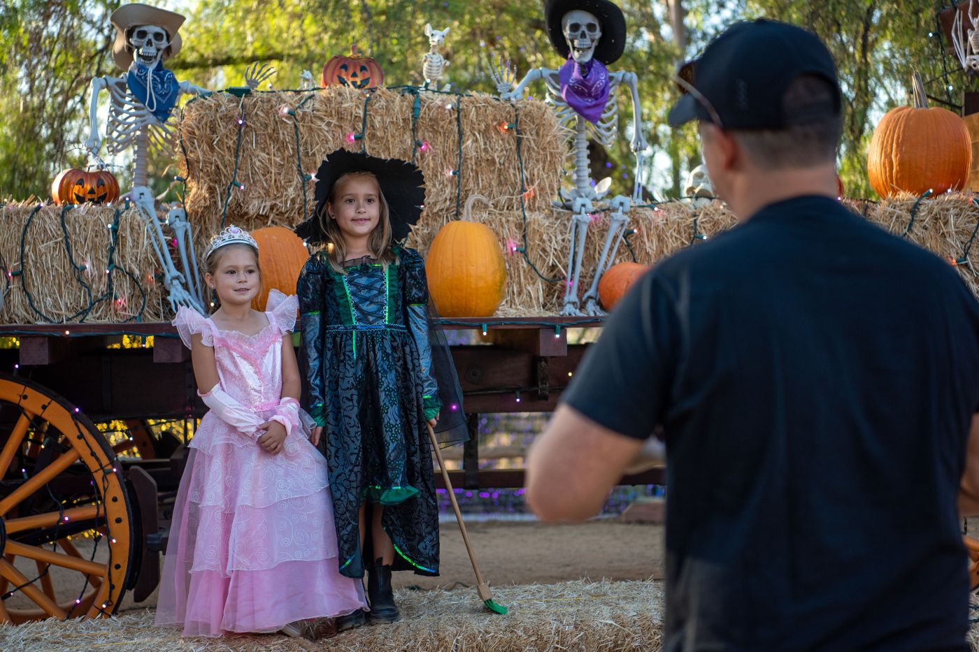 Jared Strubeck of Lake Forest takes a photo of his kids, Savana Strubeck, 7, and Adeline Strubeck, 5, in front of a skeleton-covered hay wagon at Heritage Hill Historical Park in Lake Forest during the 5th annual Fall-O-Ween event, sponsored by OC Parks, on Saturday, Oct. 11, 2025. (Photo by Jeff Antenore, Contributing Photographer) -