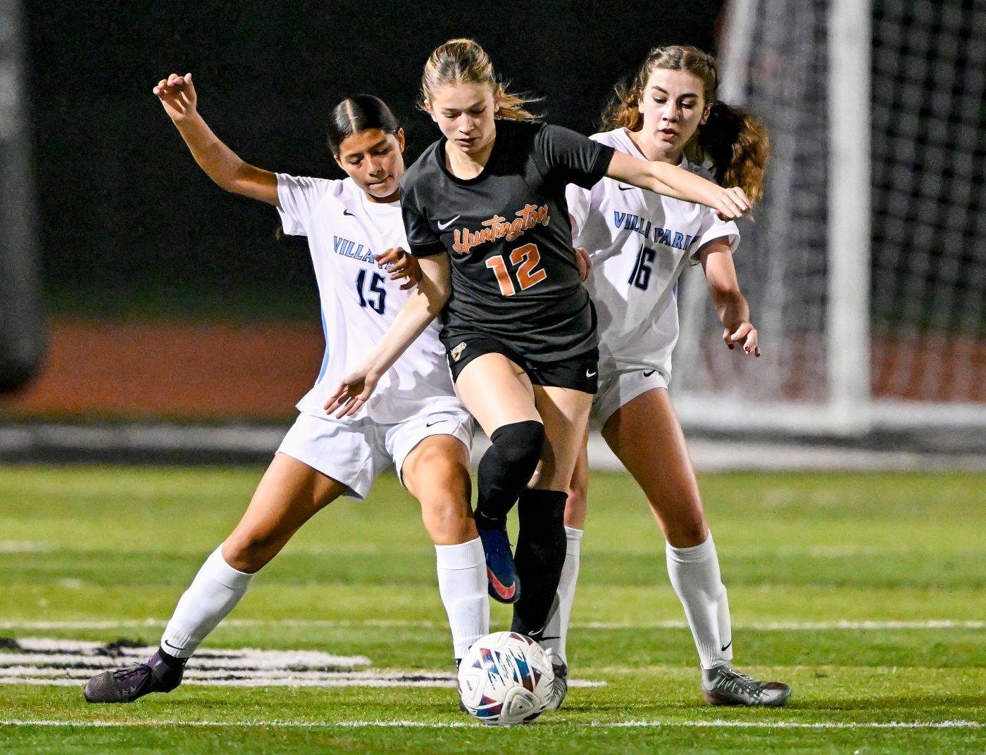 Olivia Young (12) of Huntington Beach moves the ball up field as she is squeezed Alexa Erazo (15) and Finley Tomasick (16) of Villa Park in a soccer game at Huntington Beach High School in Huntington Beach on Tuesday, December 16, 2025. (Photo by Leonard Ortiz, Orange County Register/SCNG)