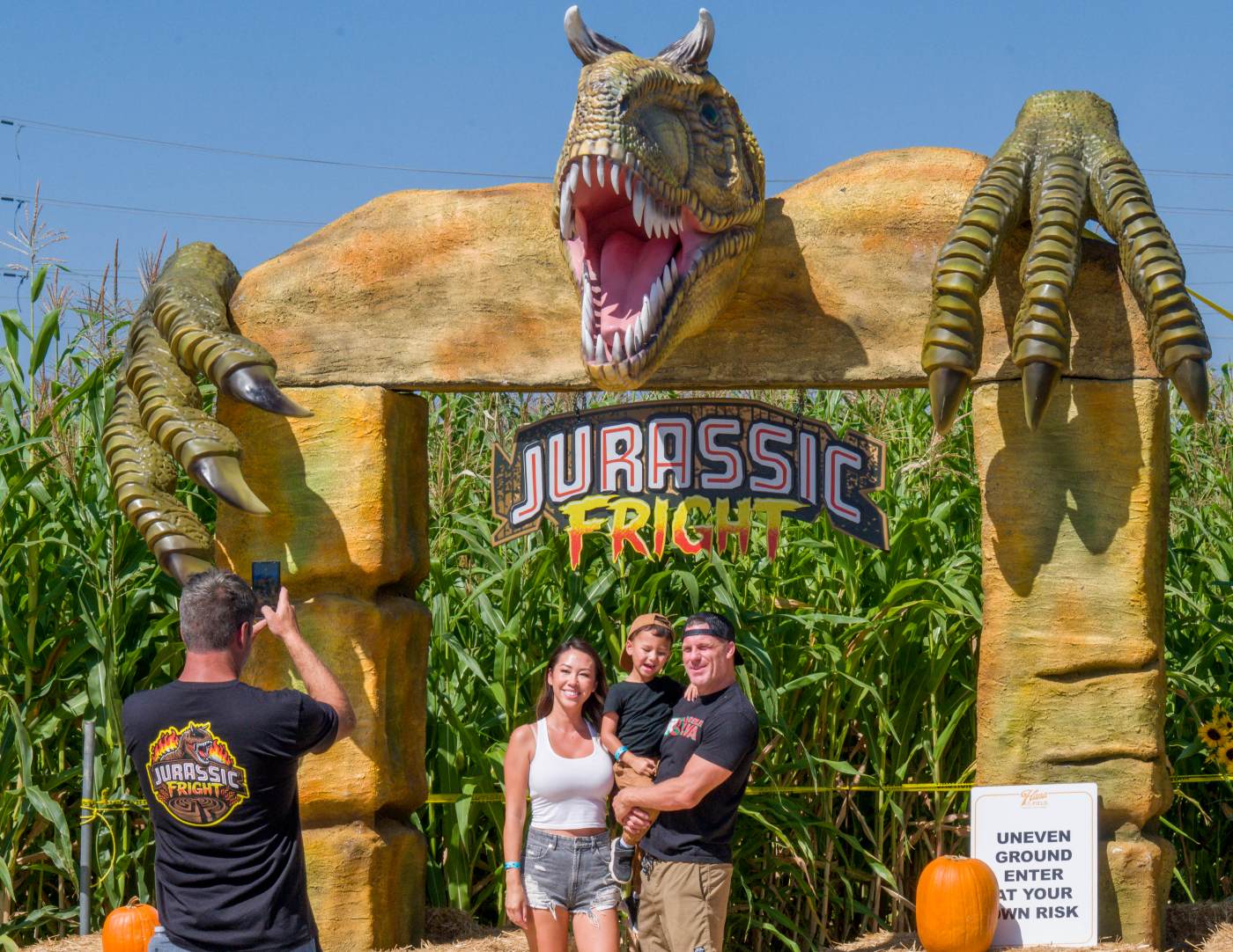 The unique pumpkin patch attraction recently launched in Costa Mesa at Hana Field by Tanaka Farms, where attendees are greeted by life-size, roaring dinosaurs in a corn maze, which is also in the shape of one of the prehistoric creatures.