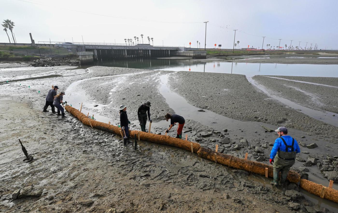 The coconut fiber logs have also been used in the Newport Back Bay, and OC Public Works installed a few not long ago in the same area of Talbert Marsh. The new project led by HBWC will bring in 120 coconut fiber logs — this week, the first group of 36 were installed in the muddy marsh.
