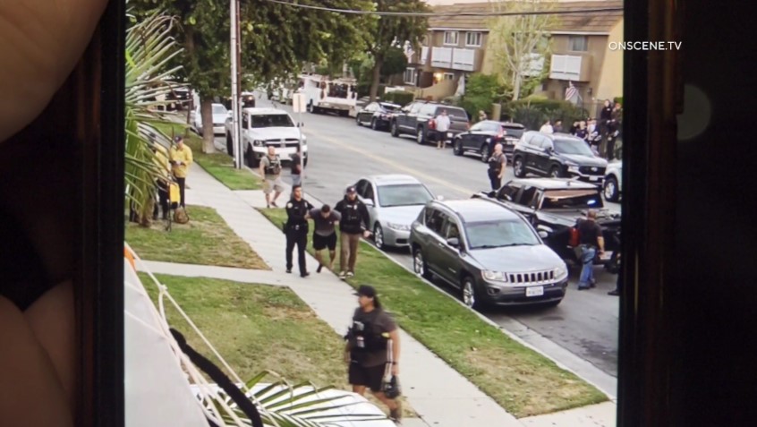 CBS LA, citing footage from its helicopter, said police let loose a K-9 into the home through a shattered back door minutes before the suspect was taken into custody. The man was seen on surveillance footage obtained by OnScene TV hopping on his right leg while being helped to a patrol vehicle by officers.