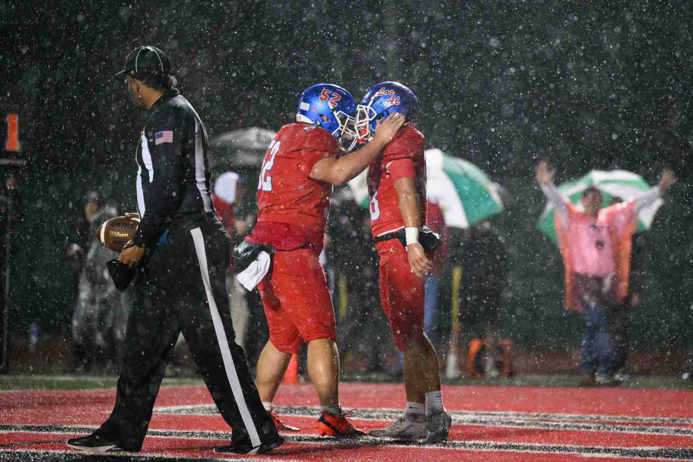 Los Alamitos’ Lenny Ibarra (28), right, is greeted by Braiden McKenna (52) after scoring during the quarterfinals of the CIF-SS Division 2 football playoffs against San Juan Hills at Veterans Stadium, Friday, Nov. 14, 2025, in Long Beach, Calif. (Photo by William Liang, Contributing Photographer) -