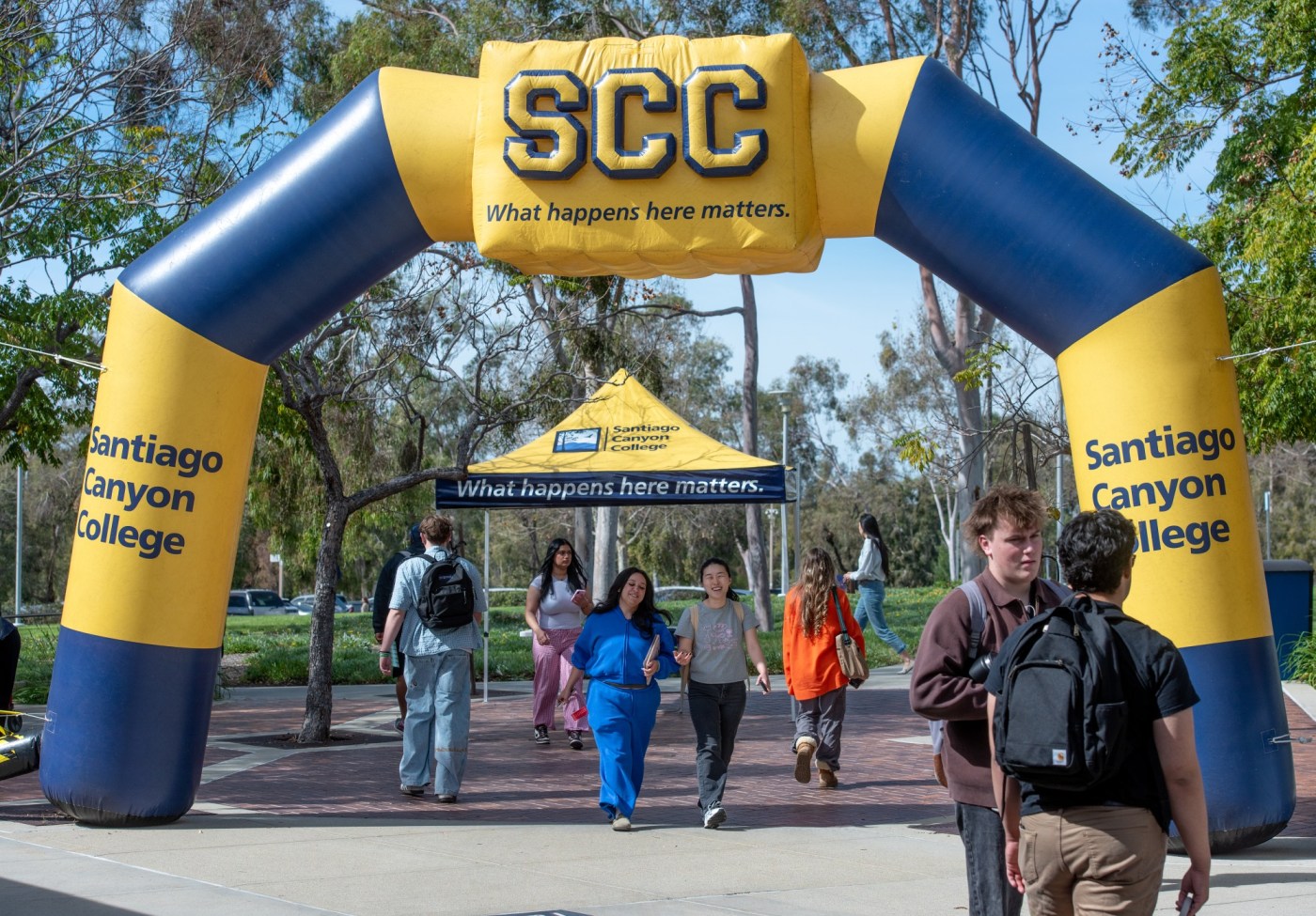 Students arrive on campus through a giant SCC arch during the first day of the spring semester at Santiago Canyon College on Monday, February 9, 2026. (Photo by Jeff Antenore, Contributing Photographer)