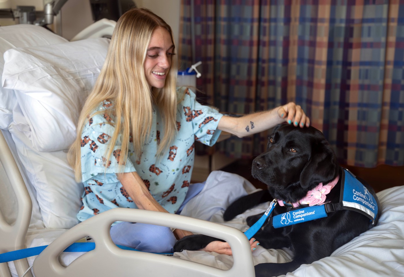 Patrick McElvogue smiled broadly when Haines tentatively approached his 7-year-old daughter, Jordan, in a playroom. He told his daughter he had owned a similar lab as a child. Jordan, sore from an appendectomy, had not been moving much, McElvogue said. But she got down on the ground to be eye-level with Haines and stroked her soft fur.
