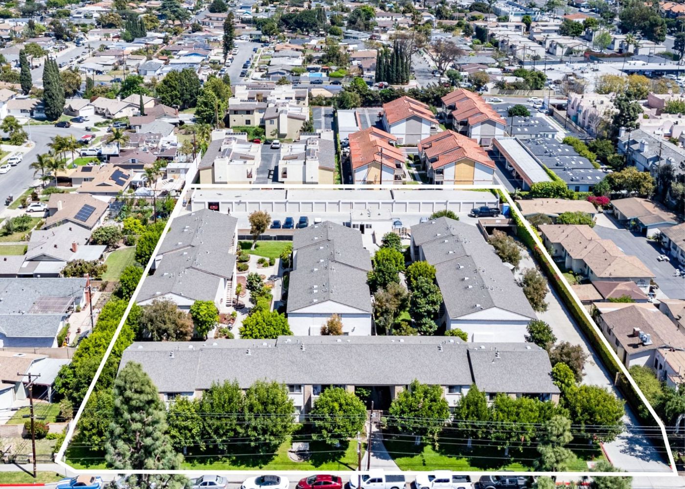 The complex includes 15 units across six one- and two-story buildings on a 0.8-acre parcel.
