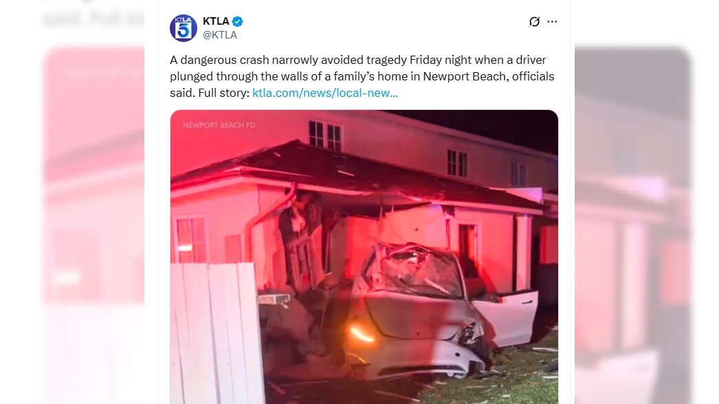 A Tesla crashed through the walls of a Newport Beach home on Friday evening, coming to rest inside the downstairs bedroom where two children had been moments earlier,  KTLA 5 reported on Saturday.