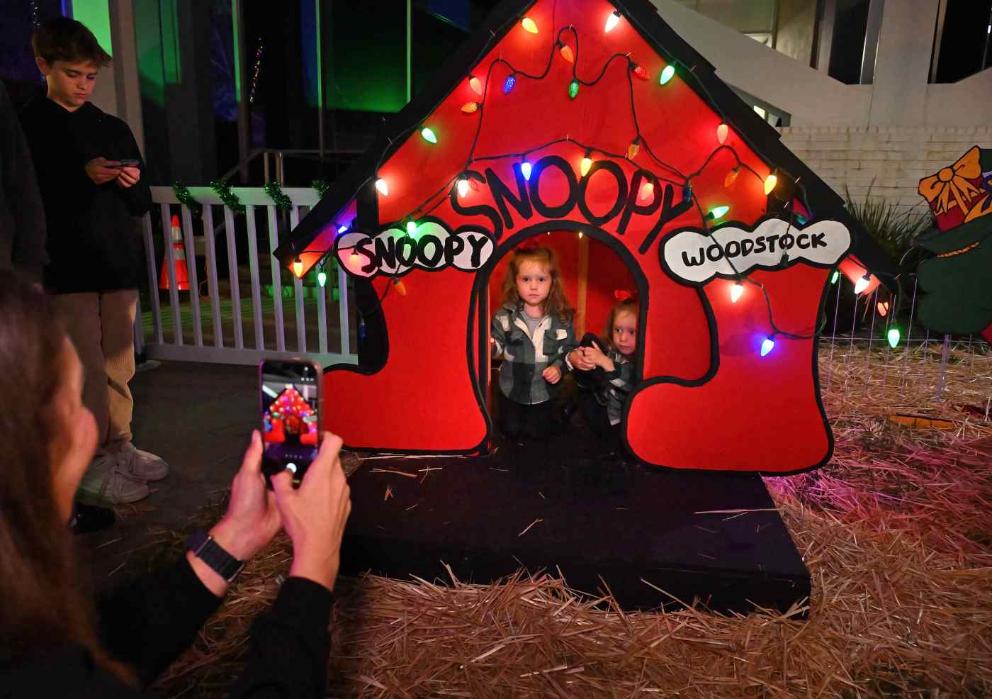 Jordyn Monsoor of Huntington Beach and her twin sister, Brynn, 2, have their photo taken inside Snoopy’s dog house during Costa Mesa’s Snoopy House Christmas display at the city’s Civic Center, December 14, 2025. (Photo by Steven Georges, Contributing Photographer) -
