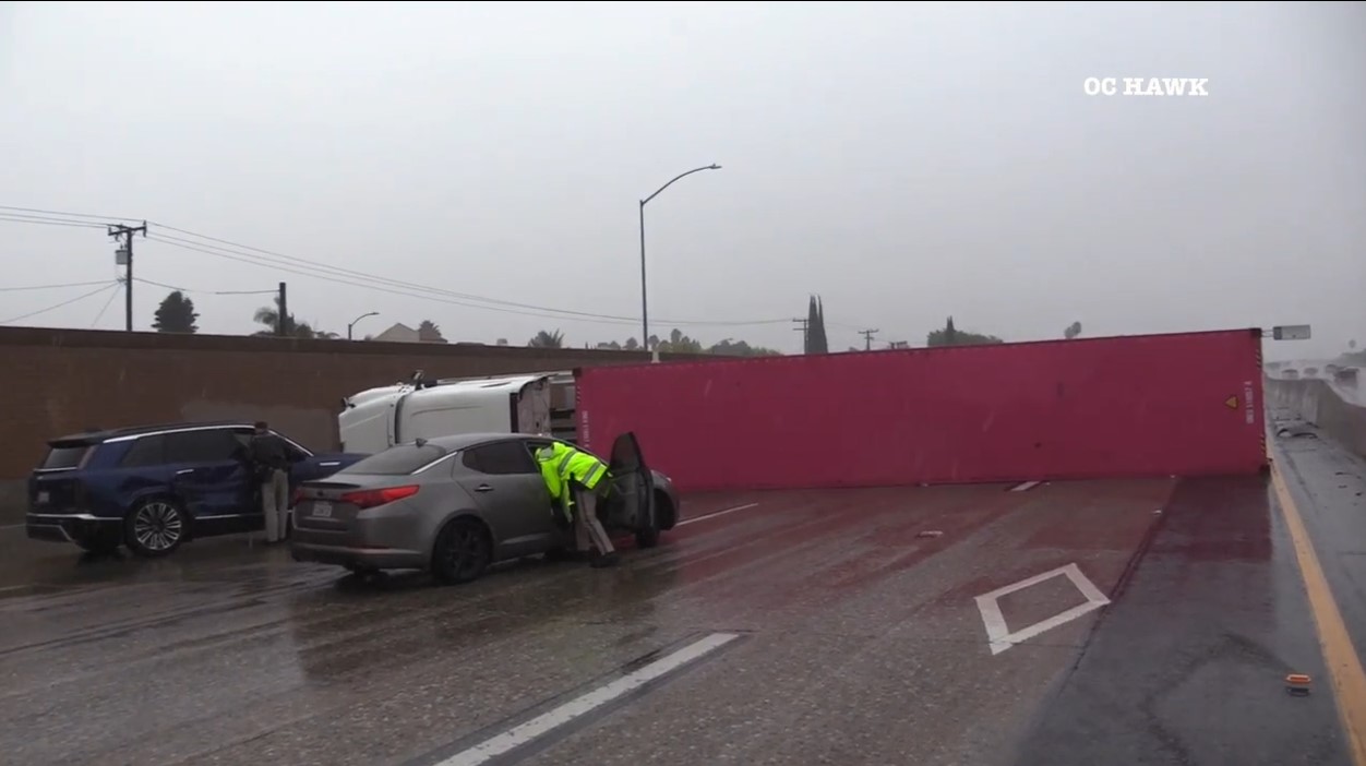An overturned big rig blocked all lanes of the westbound 91 Freeway near Brookhurst Street in Anaheim on Tuesday morning, Oct. 14, amid a storm, according to the California Highway Patrol.