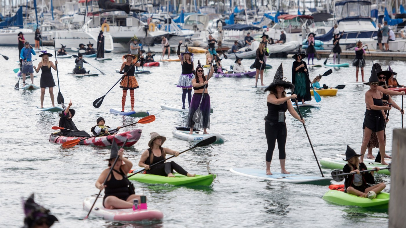 A gathering of decked-out kayakers and paddlers dressed as witches held an annual Halloween jaunt around Dana Point Harbor on Sunday, Oct. 26, launching from Pure Watersport and making their way toward Baby Beach.