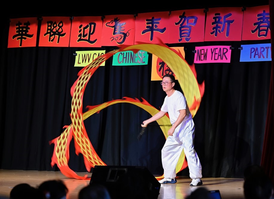 Mistress of Ceremonies Cathy Chang then introduced David Zhang performing the dragon dance “Soaring Dragon, Rising Higher with Every Step.”